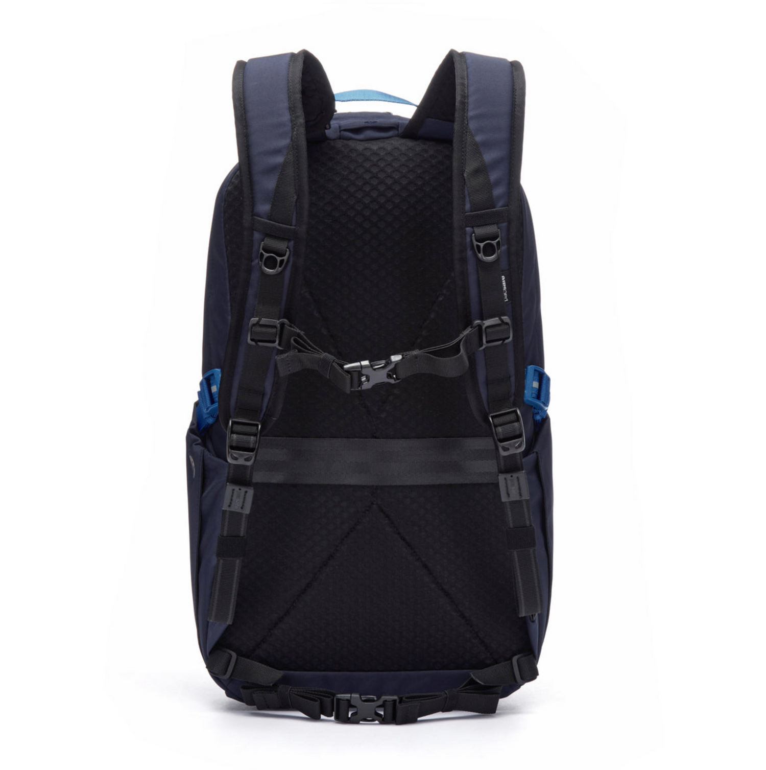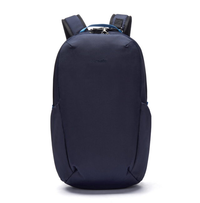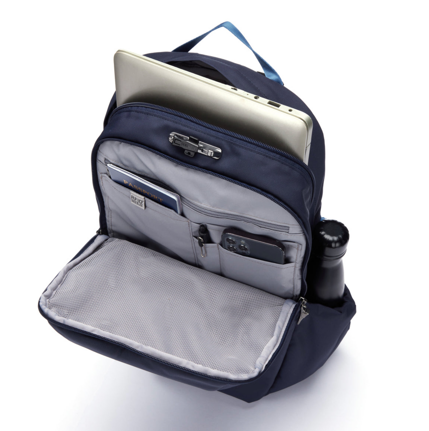 This spacious and sleek anti-theft backpack combines security and functionality. It features two roomy lockable compartments that can accommodate your travel essentials, along with a dedicated laptop sleeve designed to fit a 13-inch MacBook. For added comfort during your travels, the backpack is equipped with an adjustable sternum strap and hip belt. Additionally, the convenient luggage slip on the back allows you to securely attach the backpack to wheeled luggage handles, facilitating smoother journeys.