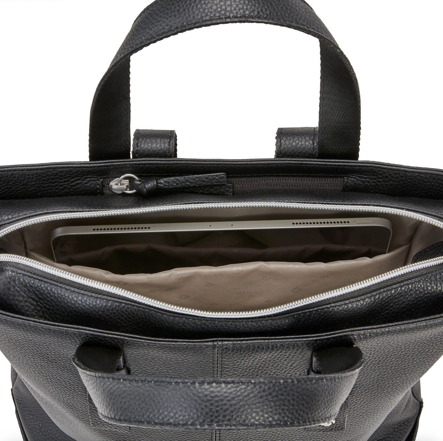 - Padded tablet pocket. Fits most 13" tablets