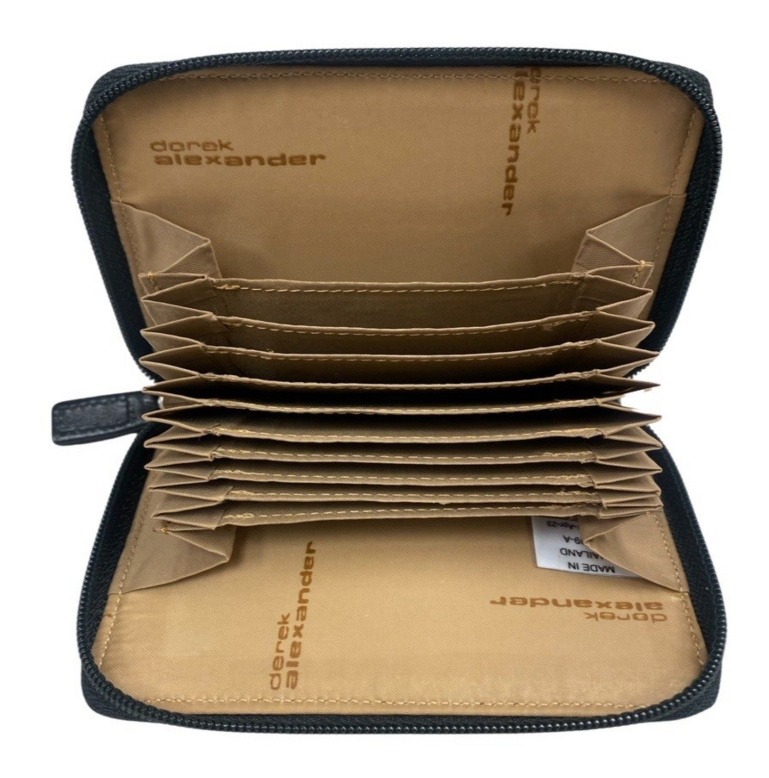 - A full zip opens to store nine individual credit cards that fan out to reveal your cards in an easy-to-find format.