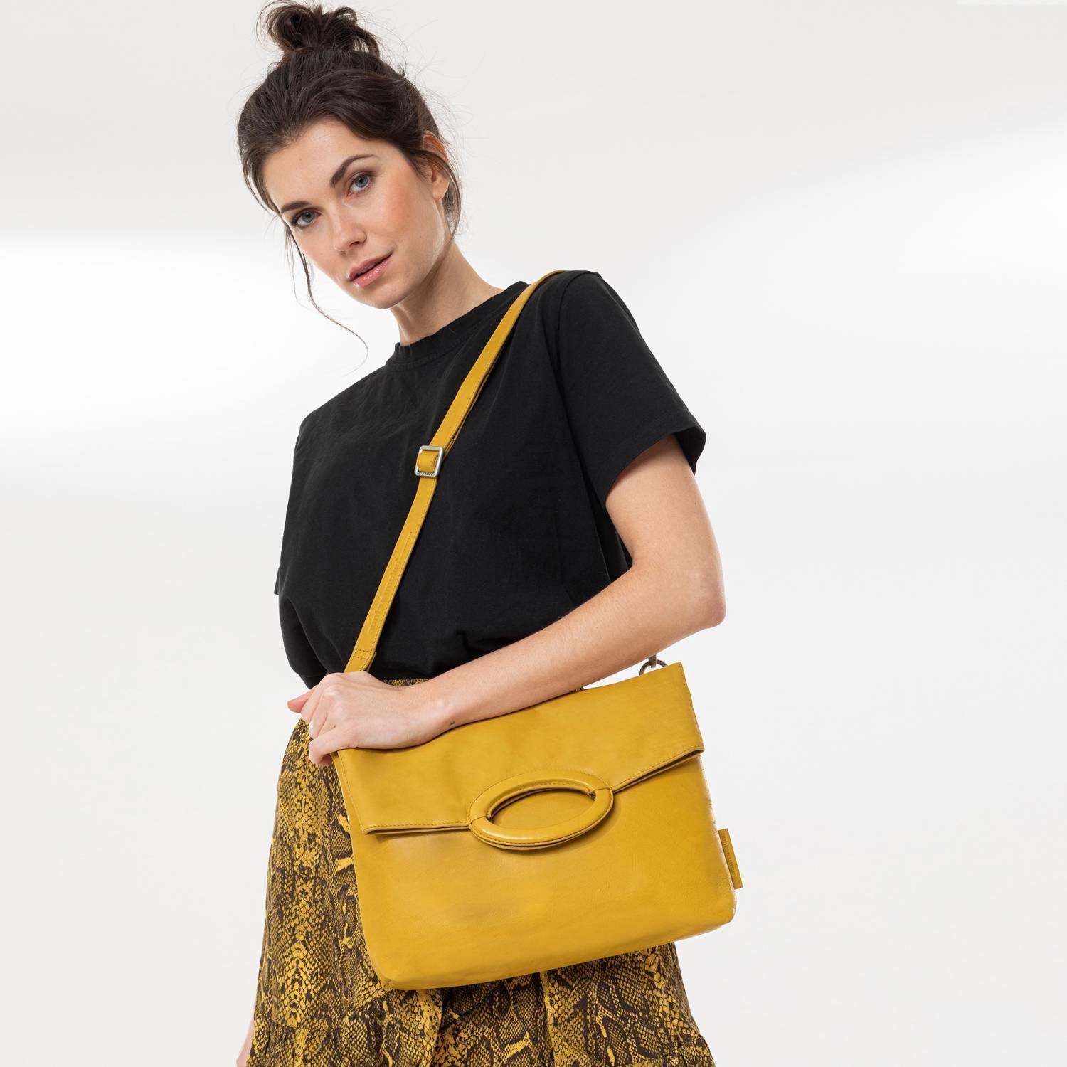 Its design is minimalist and yet the butter-soft Mangosteen is a real all-rounder, because it can be worn not only as a shoulder bag and as a pouchy clutch under the arm. Unfolded and held by its decorative, round handle, it becomes a spacious shopper with a practical interior layout. Its soft leather comes from a certified tannery that is a member of the Leather Working Group, whose focus is on minimising environmental impact.